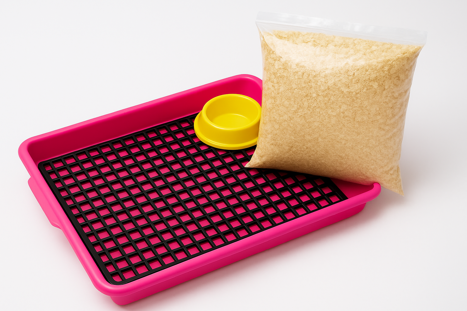 Kit Bandeja Sanitário Saniplus + Serragem e Comedouro Para Mini Coelho Porquinho da India Chinchila Cor Rosa